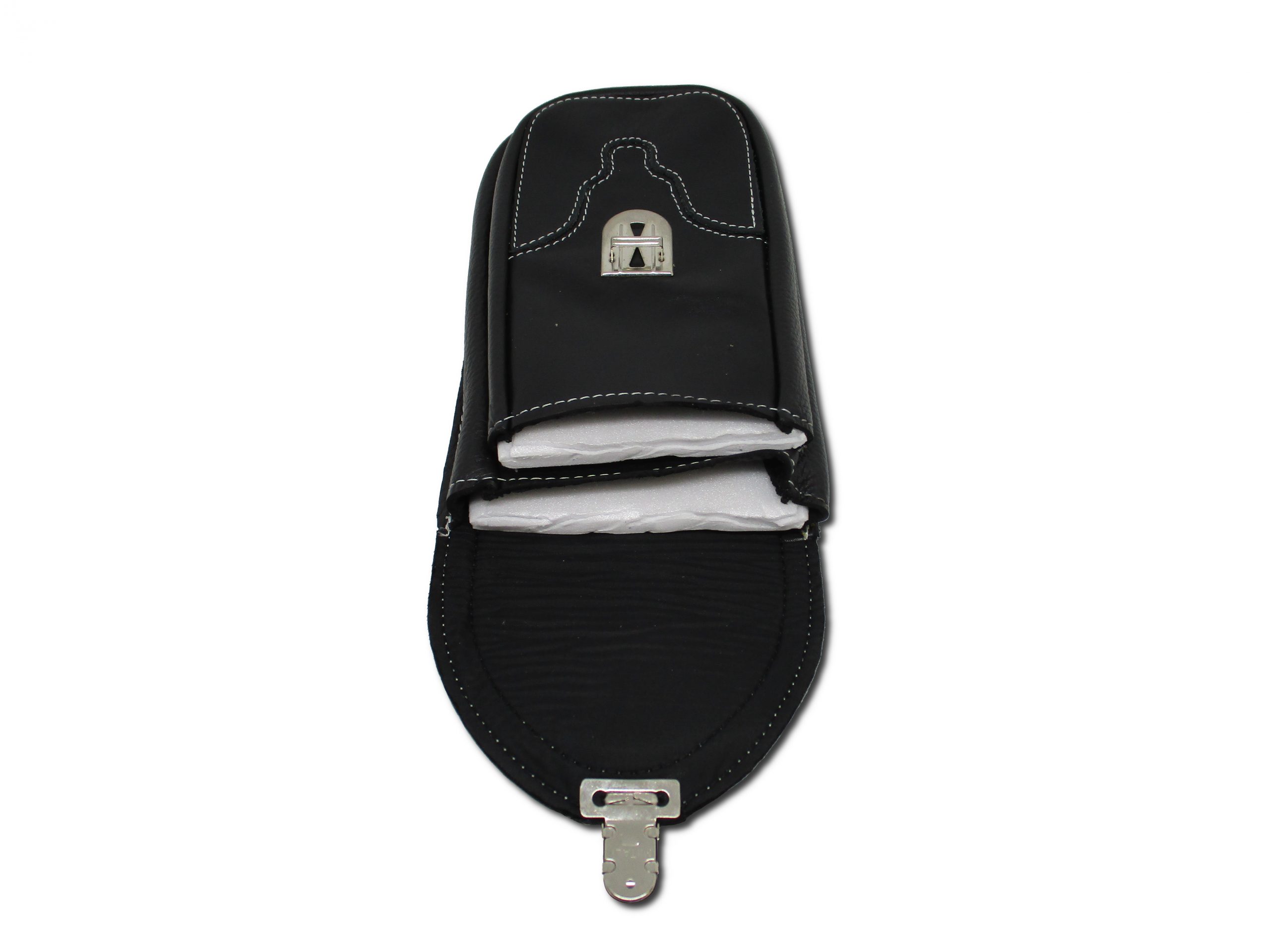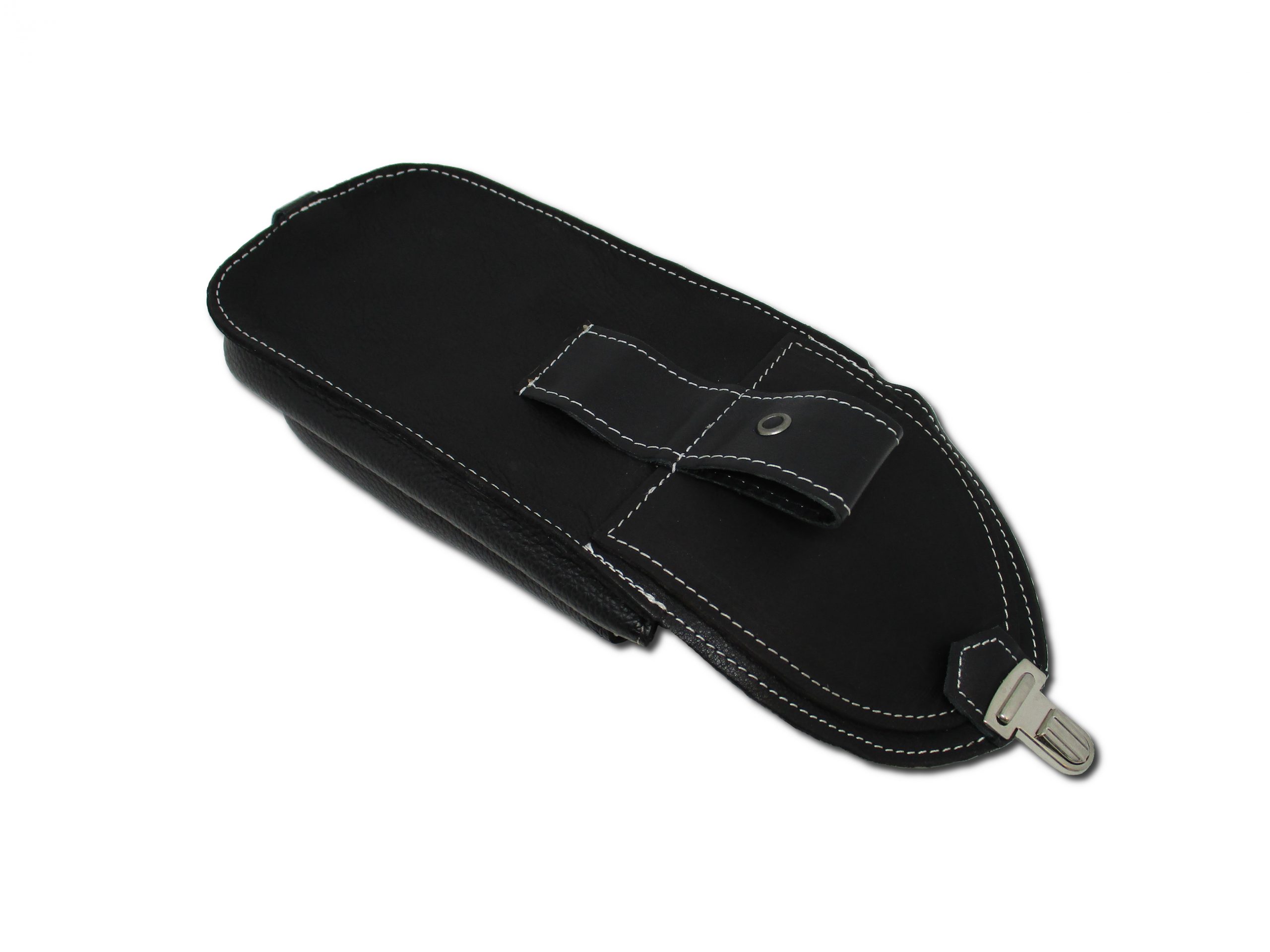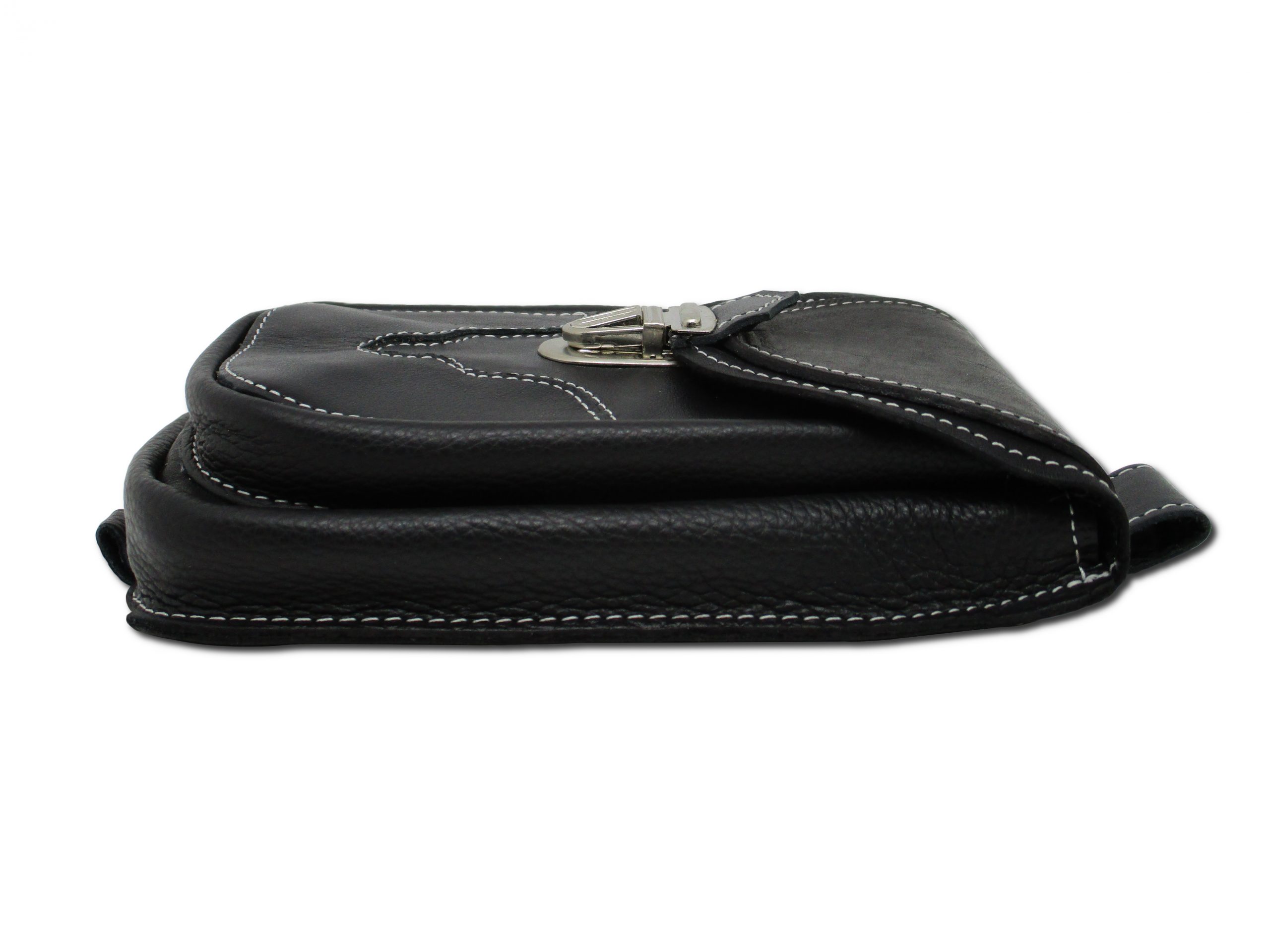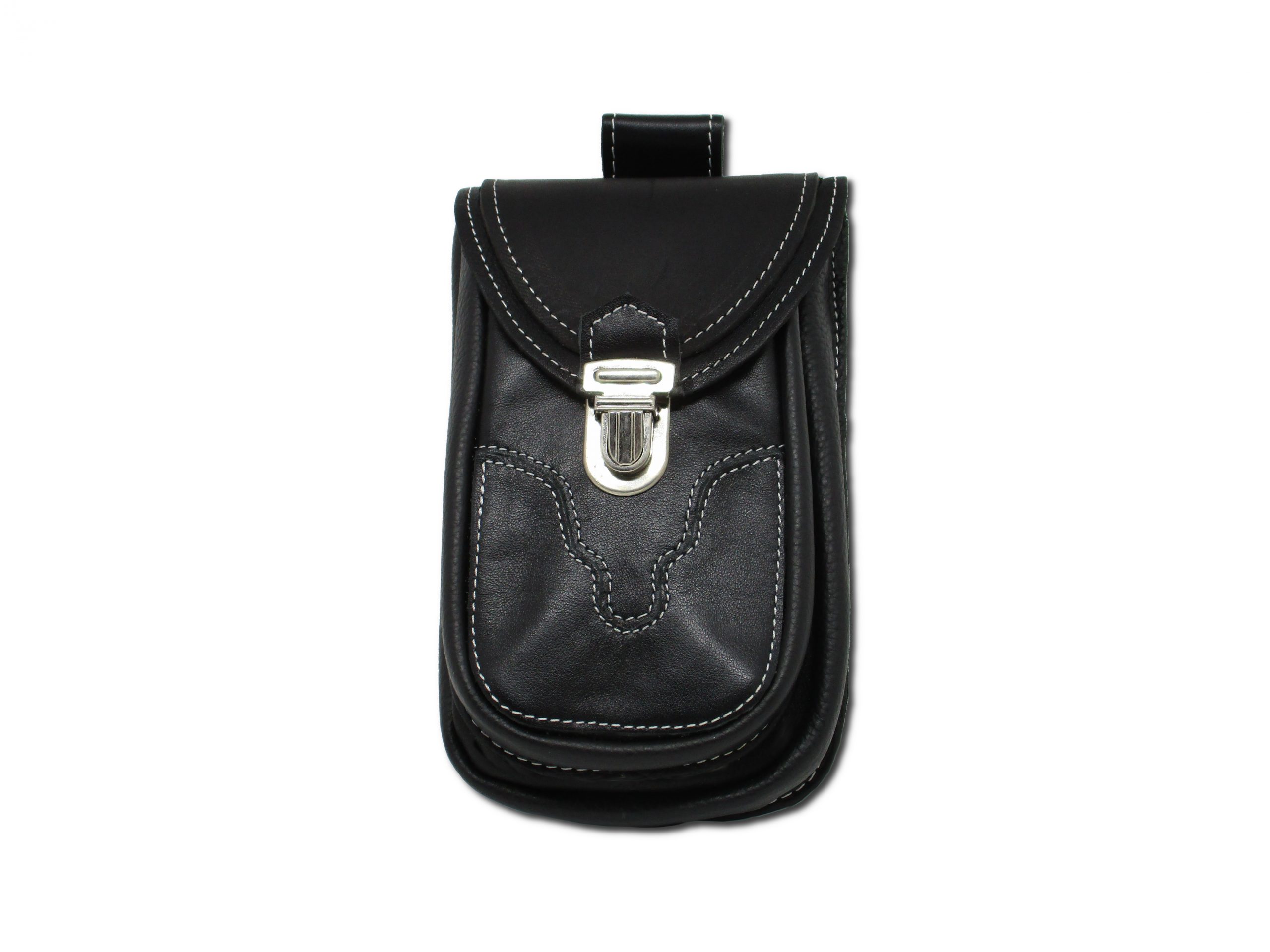 Borsello con passante per cintura in pelle nera con cucitura bianca e chiusura a scatto.