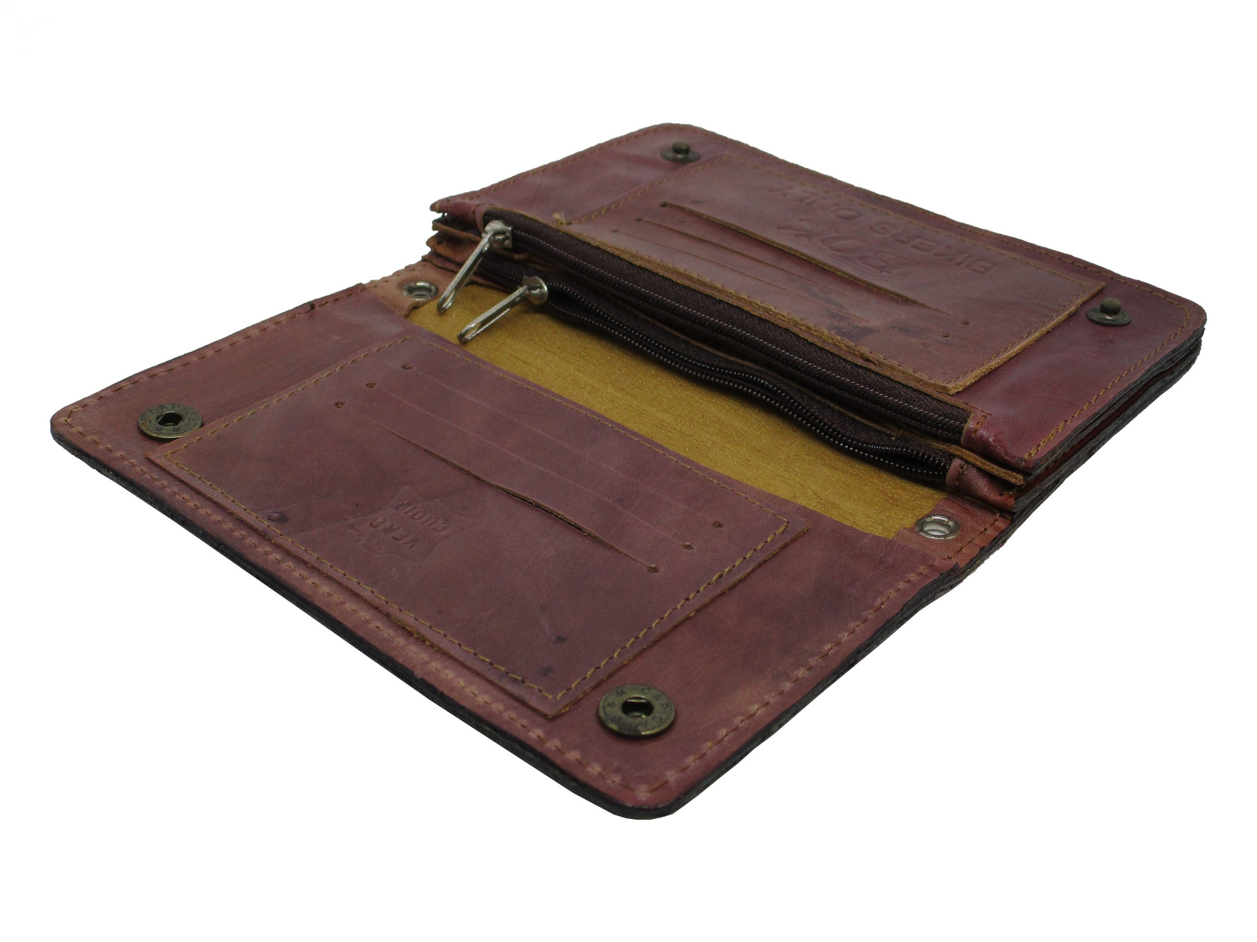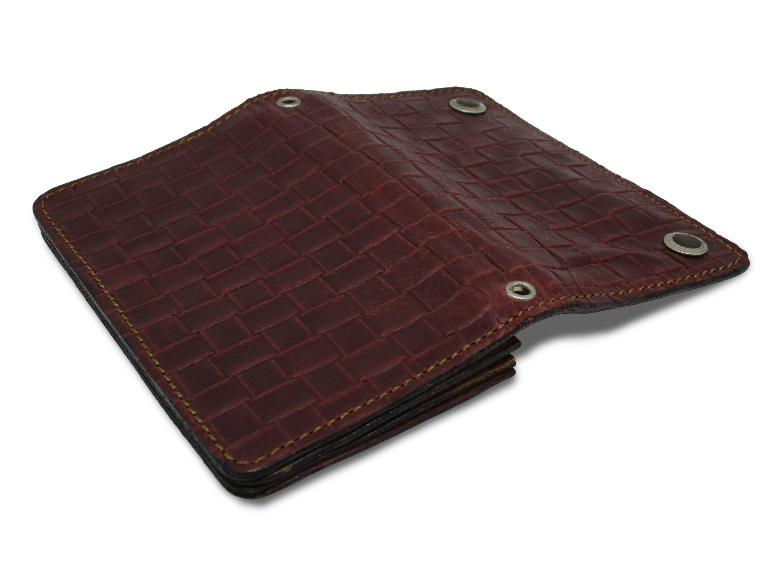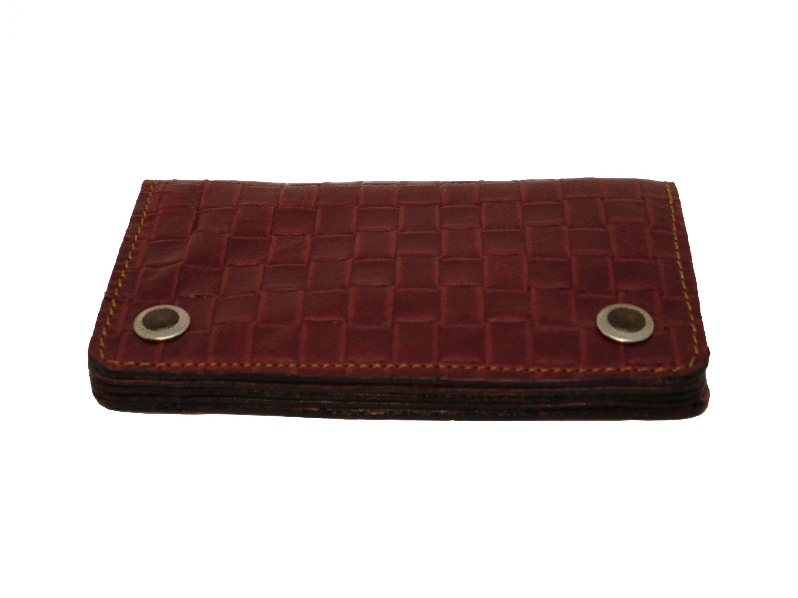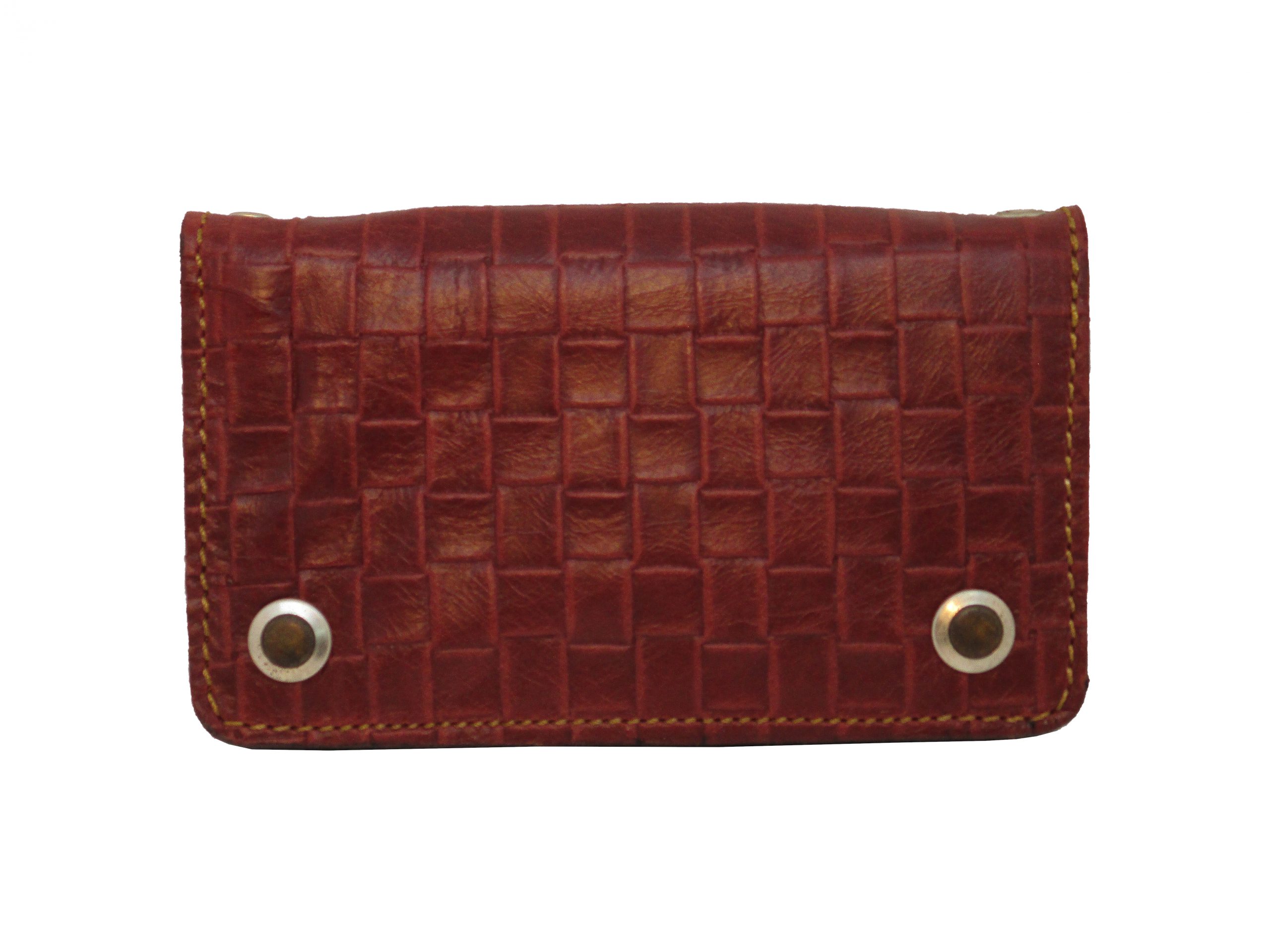 portafogli a libro con bottoni completamente in cuoio stampato effetto intrecciato rosso bordo.